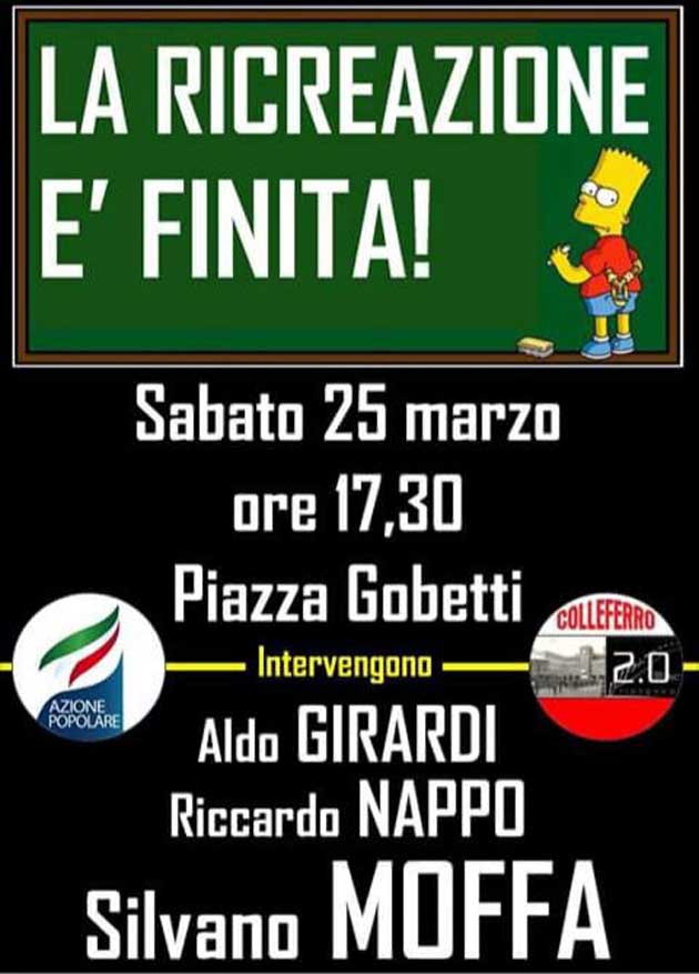 COLLEFERRO (RM) – Nel pomeriggio di oggi, Sabato 25 Marzo alle ore 17,30 in Piazza Gobetti, le liste “Azione Popolare” e “Colleferro 2.0” scendono in… piazza e «lo fanno con lo slogan LA RICREAZIONE È FINITA che vuole essere un richiamo a tutti coloro rimasti sordi al suono della campanella.