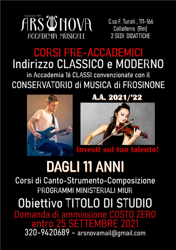 COLLEFERRO – Scade questo Sabato, 25 Settembre, il termine ultimo per la presentazione delle domande di ammissione ai Corsi Professionali Pre-Accademici, dell’Accademia Musicale Ars Nova di Colleferro, convenzionati con il Conservatorio di Frosinone, ad indirizzo sia Classico che Moderno ed a partire dall’età di 11 anni.