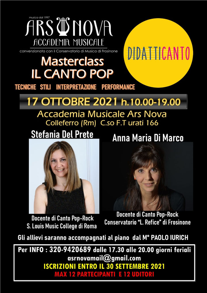 L’Accademia compie quest’anno 25 anni di vita ed inaugura il nuovo Anno Accademico con un evento di spicco nel ventaglio delle svariate offerte formative, la Masterclass Di Canto Pop del 17 Ottobre 2021, tenuta da due docenti d’eccezione nel panorama didattico del Canto Moderno, i maestri Stefania Del Prete (docente di Canto Pop-Rock presso il S. Louis Music College di Roma) e Anna Maria Di Marco (docente di Canto Pop-Rock presso il Conservatorio “L. Refice” di Frosinone). Pianista accompagnatore il M° Paolo Iurich, docente in Accademia del Corso Pre-Accademico di Pianoforte Moderno.
