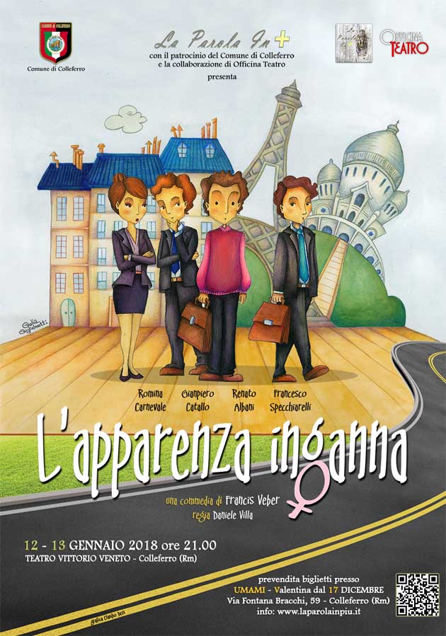 COLLEFERRO (RM) – L’associazione culturale “La parola in più”, porta in scena il 12 e il 13 Gennaio al Teatro Vittorio Veneto di Colleferro, lo spettacolo teatrale: “L’apparenza Inganna” di Francis Veber (adattamento di Diego Piccioni e di Daniele Villa), regia di Daniele Villa.