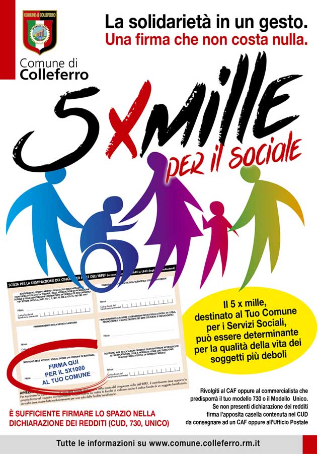 «Destinare il 5‰ al Comune per i Servizi Sociali può essere determinante per la qualità della vita di molti concittadini. Anche quest’anno i contribuenti di Colleferro potranno, in fase di compilazione delle loro denunce dei redditi, destinare il 5‰ delle loro trattenute Irpef a sostegno di interventi nel sociale.