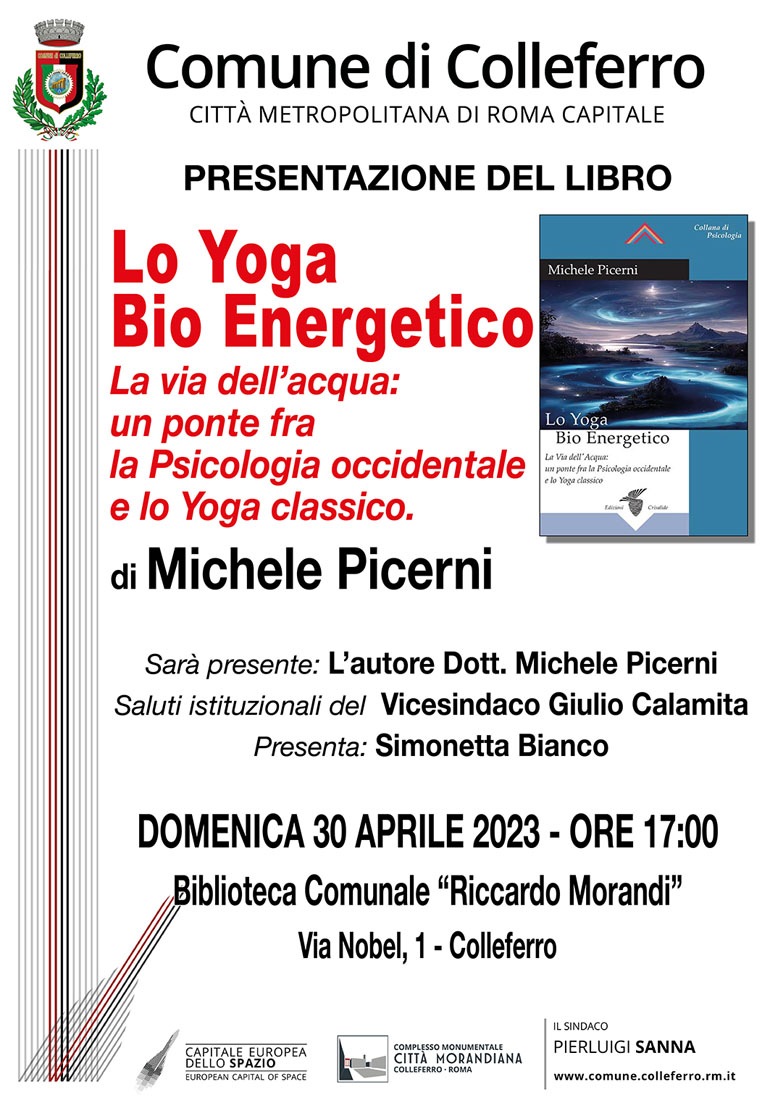 Il 30 Aprile alle ore 17.00 si svolgerà la presentazione del libro di Michele Picerni “Lo Yoga Bio Energetico. la via dell’acqua: un ponte fra la Psicologia Occidentale e lo Yoga Classico”, un volume che si propone di porre l’accento sulla consapevolezza dell’esperienza del momento presente, dando spazio e risonanza alle sensazioni fisiche, alle emozioni e ai bisogni e permettendo, in questo modo, di creare un rapporto autentico con se stessi, con gli altri e con la vita.