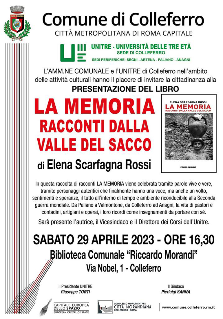 Il 29 Aprile alle ore 16.30 sarà presentato il libro di Elena Scarfagna Rossi “La memoria. Racconti della valle del sacco”, una raccolta di racconti in cui la memoria viene celebrata tramite parole vere e personaggi autentici del nostro territorio, i loro ricordi come insegnamenti da portare con sé.