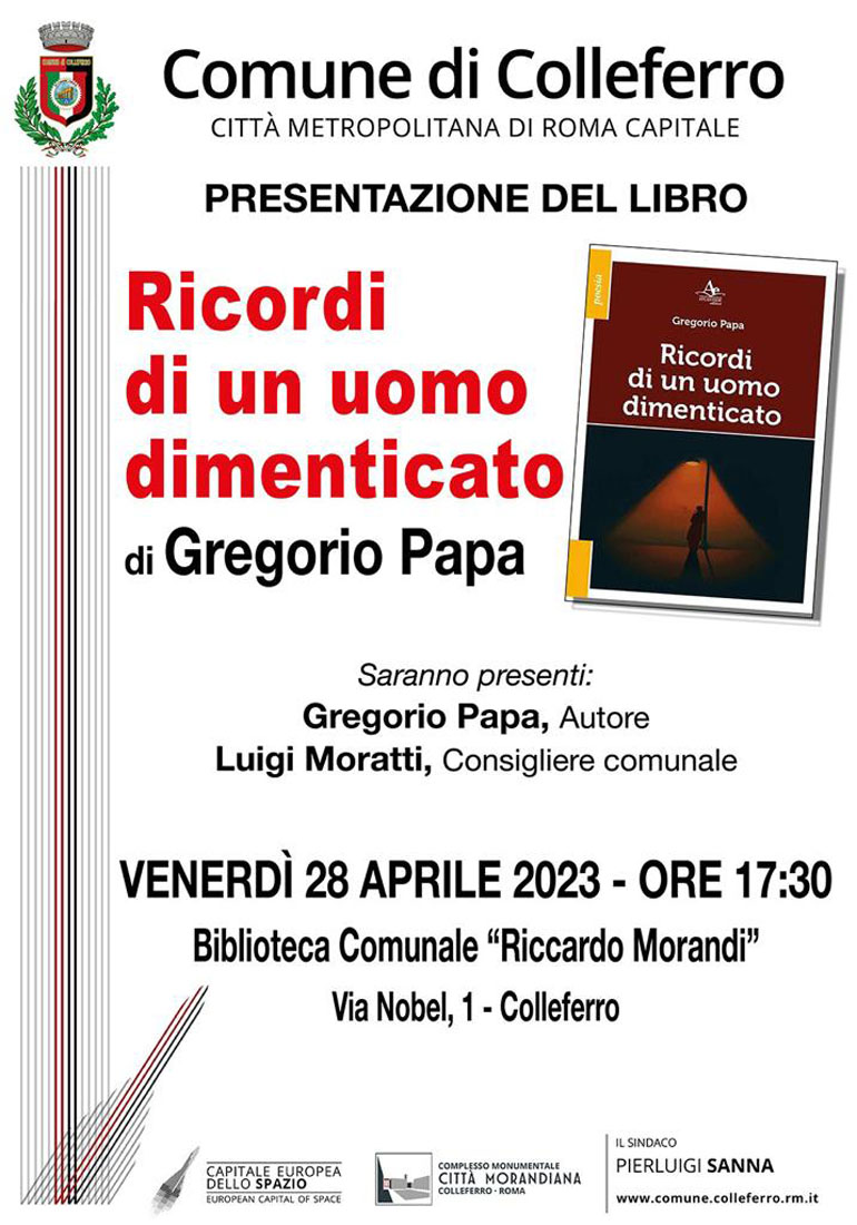 Il 28 Aprile alle ore 17.30 verrà presentato il libro “Ricordi di un uomo dimenticato” di Gregorio Papa, una raccolta che si concentra sulla vita di un uomo che vive senza essere notato, un uomo perso in un mondo in cui le persone restano indifferenti al suo dolore, un uomo che cerca rifugio nella natura e nella grandezza dell’universo.