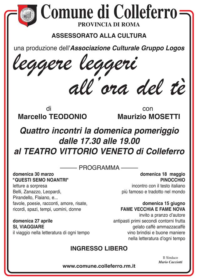 La produzione, che si intitola “Leggere leggeri all’ora del tè”, di Marcello Teodonio, si sviluppa in quattro domeniche pomeriggio, dalle ore 17,30 alle 19, durante le quali l’attore Maurizio Mosetti presenterà un interessante viaggio nella letteratura seguendo un filo tematico che lo renderà particolarmente interessante.