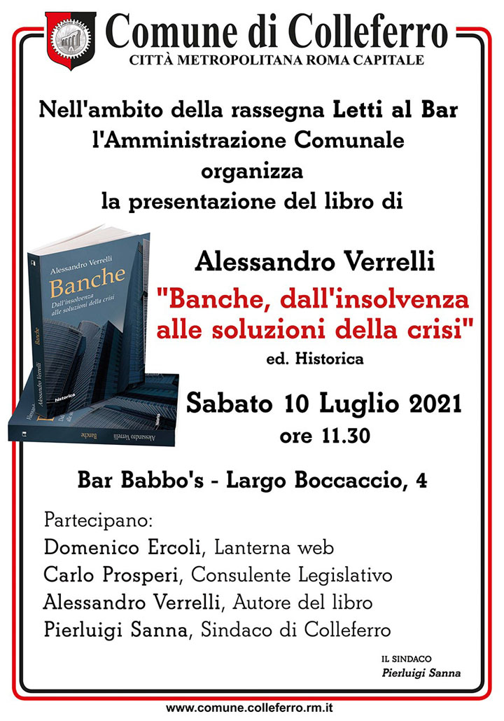 COLLEFERRO – Nell’ambito della rassegna “Letti al Bar”, l’Amministrazione comunale di Colleferro ha organizzato per Sabato 10 Luglio, alle ore 11,30, presso il Bar Babbo’s di Largo Boccaccio 4, la presentazione del libro di Alessandro Verrelli “Banche, dall’insolvenza alle soluzioni della crisi”. Ed. Historica.