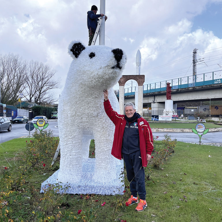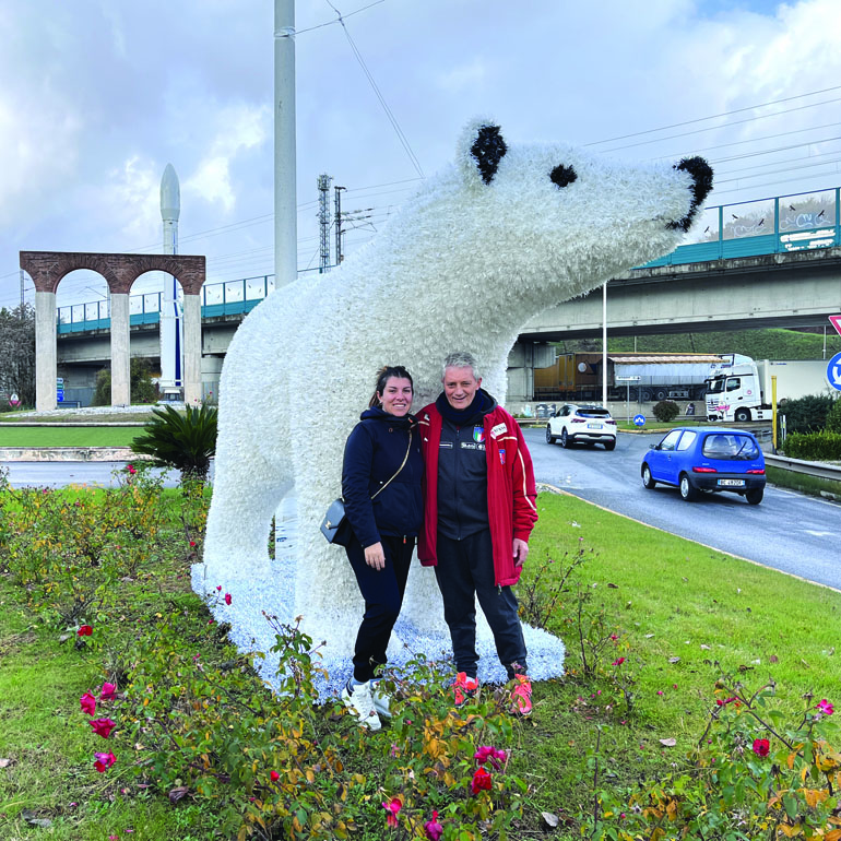 Come dicevamo, ancor prima del suo ancoraggio al suolo, l’orso ha suscitato l’interesse dei passanti… sappiamo di qualcuno che, informato da altri, si è recato appositamente sul posto. Anche l’Ass. Sara Zangrilli – di passaggio con la famiglia – non ha resistito alla tentazione di una foto (in pagina) sotto l’orso polare. Foto che, insieme a quella di Ernesto Scipioni, rende giustizia alle proporzioni dell’orso che se avesse il dono della parola augurerebbe a tutti…