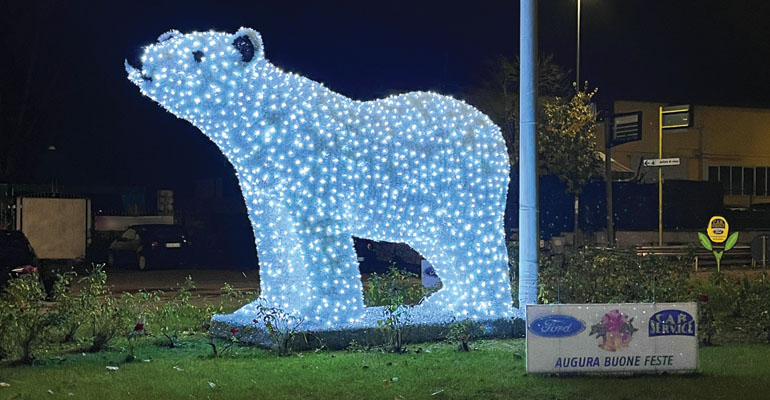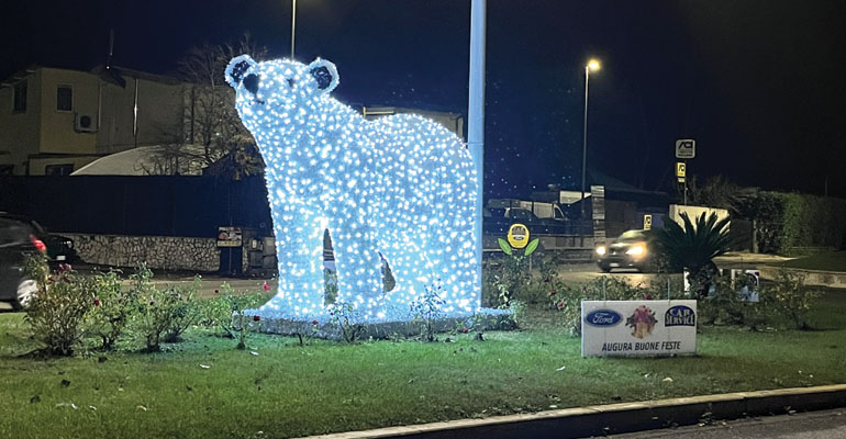 Vuoi perché è Natale, vuoi perché questo è il 30° anno di attività, vuoi perché… dopo il cigno, l’albero e la slitta dello scorso anno, la ricorrenza meritava qualcosa di più appropriato,… Ernesto Scipioni, titolare della Ford Car Service, che ha sede a pochi metri, per il Natale 2022 ha deciso di far installare un… magnifico esemplare di orso bianco, destinato a “rubare la scena”, per qualche giorno, al Vega al centro della rotatoria.