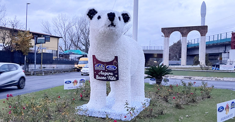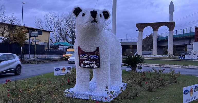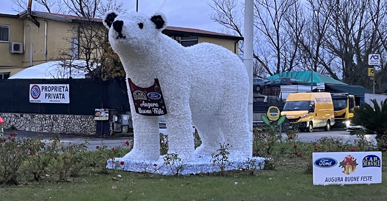 Colleferro. L’orso polare di Ford Car Service in bella mostra all’ingresso della città: «Benvenuti e Buone Feste a tutti!»