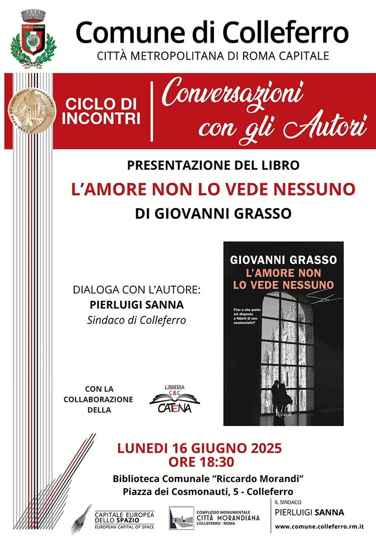 COLLEFERRO – Nel pomeriggio di oggi, 16 Giugno, alle ore 18:30 nella Biblioteca Comunale “Riccardo Morandi” di Colleferro, in Piazza dei Cosmonauti, verrà presentato il libro “L’Amore non lo vede nessuno” di Giovanni Grasso, Consigliere per la stampa del Presidente della Repubblica Sergio Mattarella.