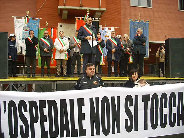 Sul palco allestito proprio sotto il palazzo comunale, alcuni degli intervenuti hanno preso la parola, a cominciare dal sindaco Mario Cacciotti che ha sottolineato quale fosse lo spirito della manifestazione, ovvero quello di dare un segnale forte circa la volontà di tutta la comunità dell’intero territorio di poter fare affidamento, ora e in futuro, su una struttura sanitaria efficiente e non deprivata di servizi essenziali.