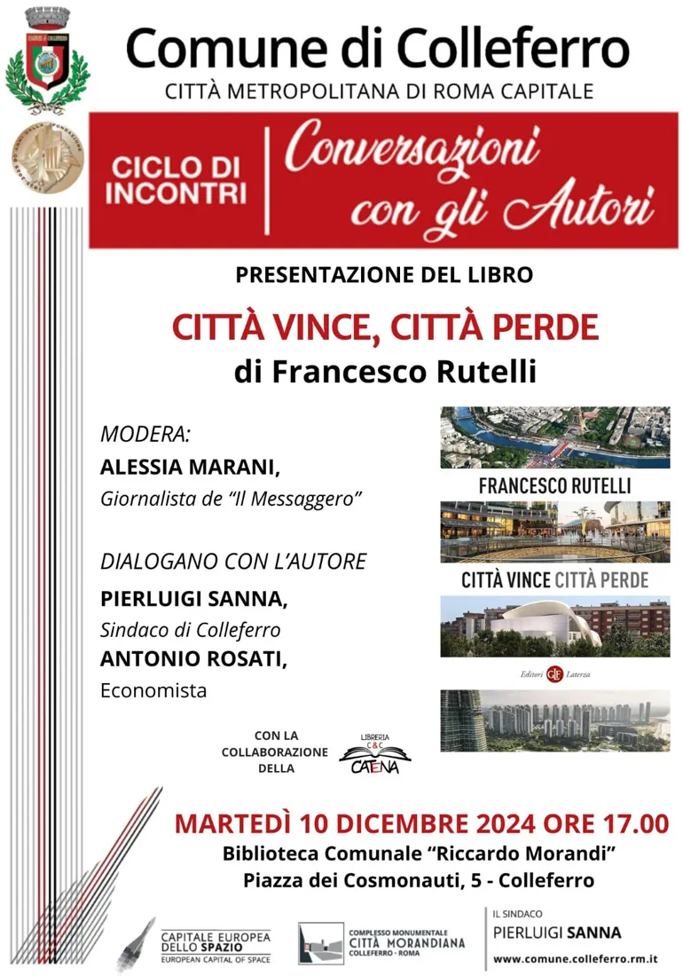 COLLEFERRO – Martedì 10 Dicembre 2024 alle ore 17, presso la Biblioteca Comunale Riccardo Morandi di Colleferro, si terrà la presentazione del libro “Città vince, città perde” di Francesco Rutelli.