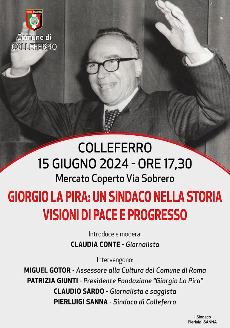COLLEFERRO — Sabato 15 Giugno alle ore 17.30 presso il Mercato Coperto di Via Sobrero, l’Amministrazione comunale di Colleferro organizza un convegno a cui partecipano Miguel Gotor Assessore alla cultura del comune di Roma, Patrizia Giunti Presidente della “Fondazione Giorgio La Pira”, Claudio Sardo giornalista e saggista, Pierluigi Sanna Sindaco di Colleferro, Claudia Conte giornalista.