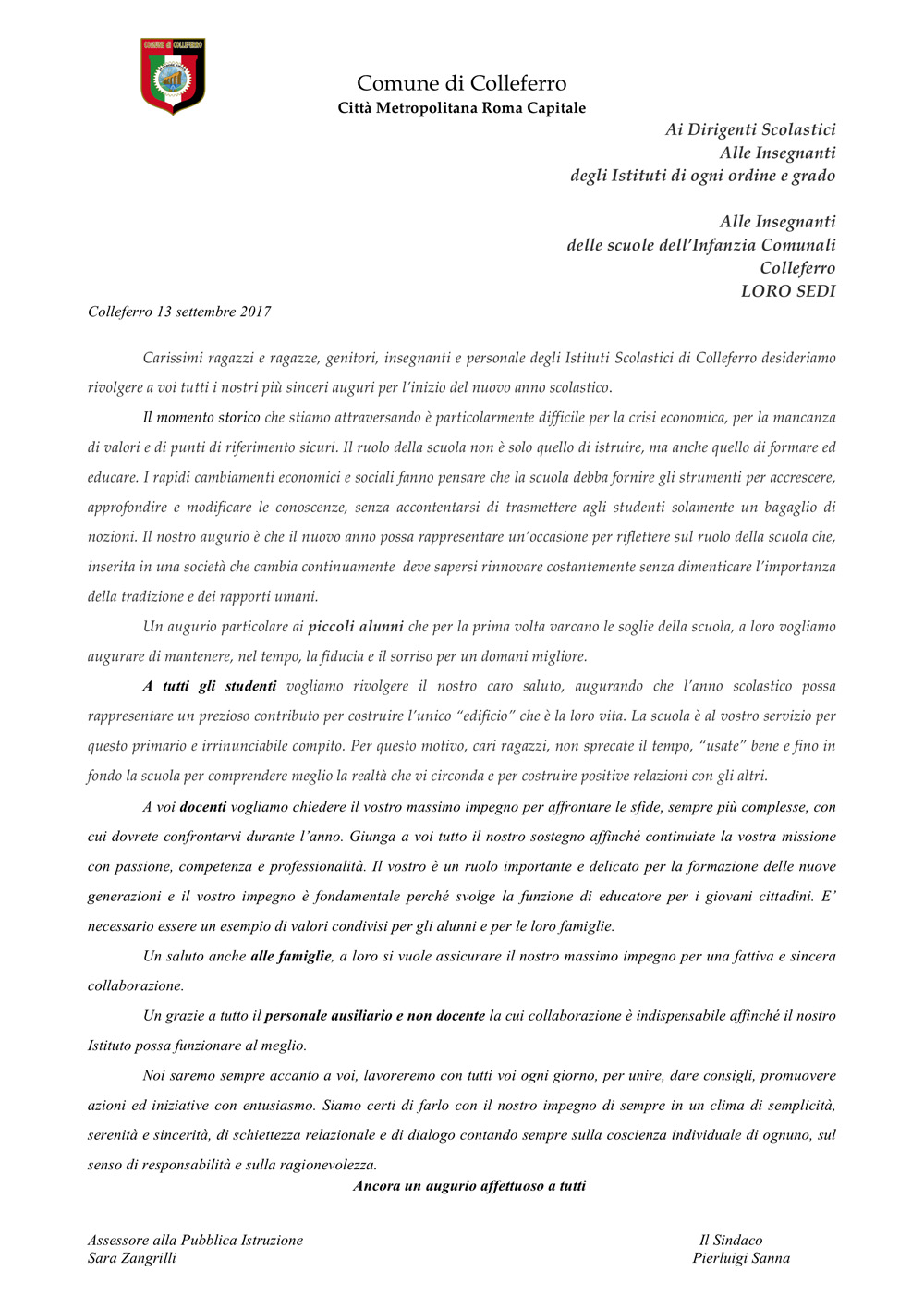 COLLEFERRO (RM) – Riceviamo e pubblichiamo di seguito copia della lettera che il Sindaco di Colleferro Pierluigi Sanna e l’Assessore alla Pubblica Istruzione Sara Zangrilli ha inviato, in occasione dell’apertura dell’Anno scolastico 2017/2018, ai Dirigenti Scolastici ed alle insegnanti delle scuole di ogni ordine e grado operanti sul territorio comunale. (click per ingrandire)