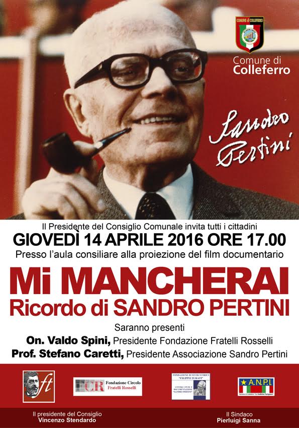 COLLEFERRO (RM) – Domani, Giovedì 14 Aprile alle ore 17 presso l’aula consiliare del Comune di Colleferro, verrà proiettato il docufilm “Mi mancherai, Ricordo di Sandro Pertini” (<• click sulla locandina per ingrandire), alla presenza dell’on. Valdo Spini Presidente della Fondazione Fratelli Rosselli e del prof. Stefano Caretti, Presidente dell’Associazione Sandro Pertini.
