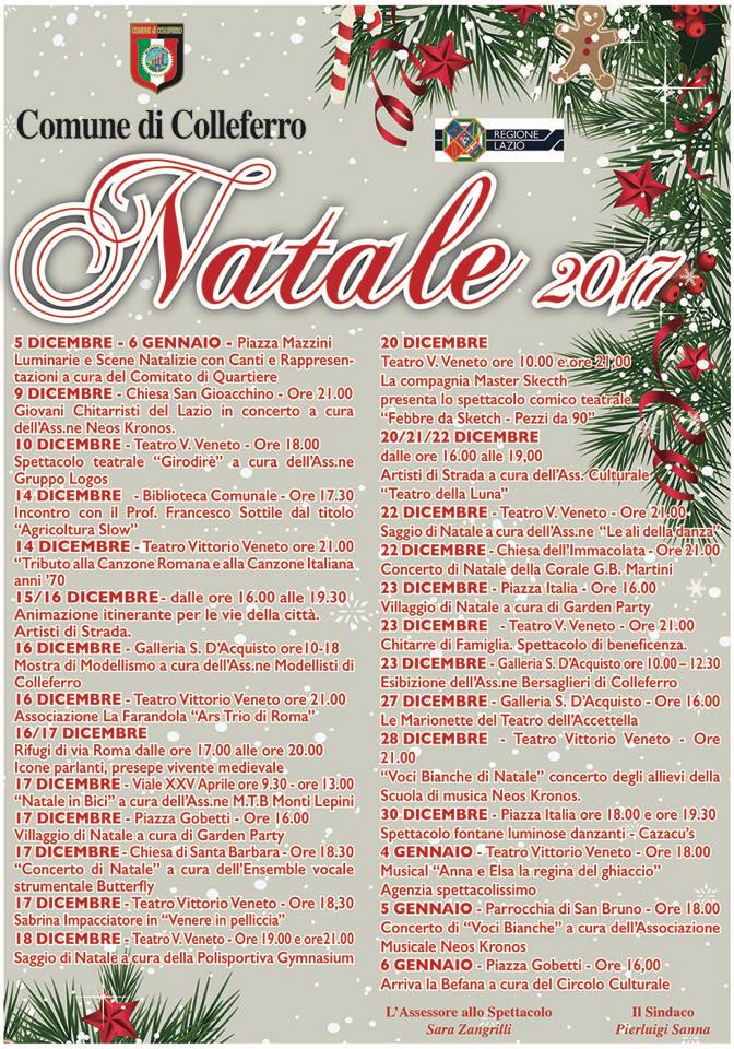 COLLEFERRO (RM) – Inaugurato ufficialmente Sabato 9 Dicembre il ricco programma di eventi natalizi che fino al 6 Gennaio animeranno la città di Colleferro, con spettacoli musicali, teatrali e di marionette, saggi di danza, mostre, eventi sportivi, fontane danzanti e l’immancabile arrivo della Befana che, ahimè, tutte le feste si porterà via.