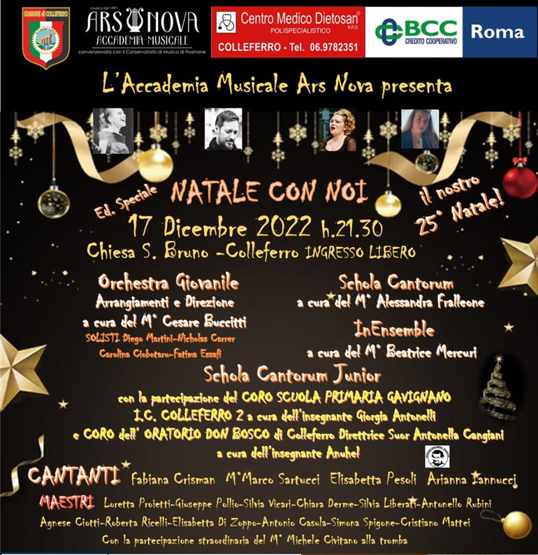 COLLEFERRO – Sabato 17 Dicembre alle ore 21,30, presso la Chiesa di San Bruno di Colleferro, sotto la Direzione Artistica del M° Alessandra Fralleone, si terrà un… incontro musicale organizzato in occasione del 25° Natale dell’Accademia Musicale Ars Nova, una Edizione Speciale di “Natale con Noi”.