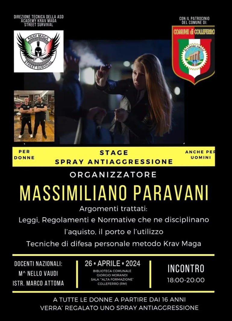 COLLEFERRO – Nel pomeriggio di Venerdì 26 Aprile, nella Sala Alta Formazione della Biblioteca Comunale “R. Morandi” si svolgerà un interessante stage Anti-aggressione con Spray al Peperoncino per donne e uomini.