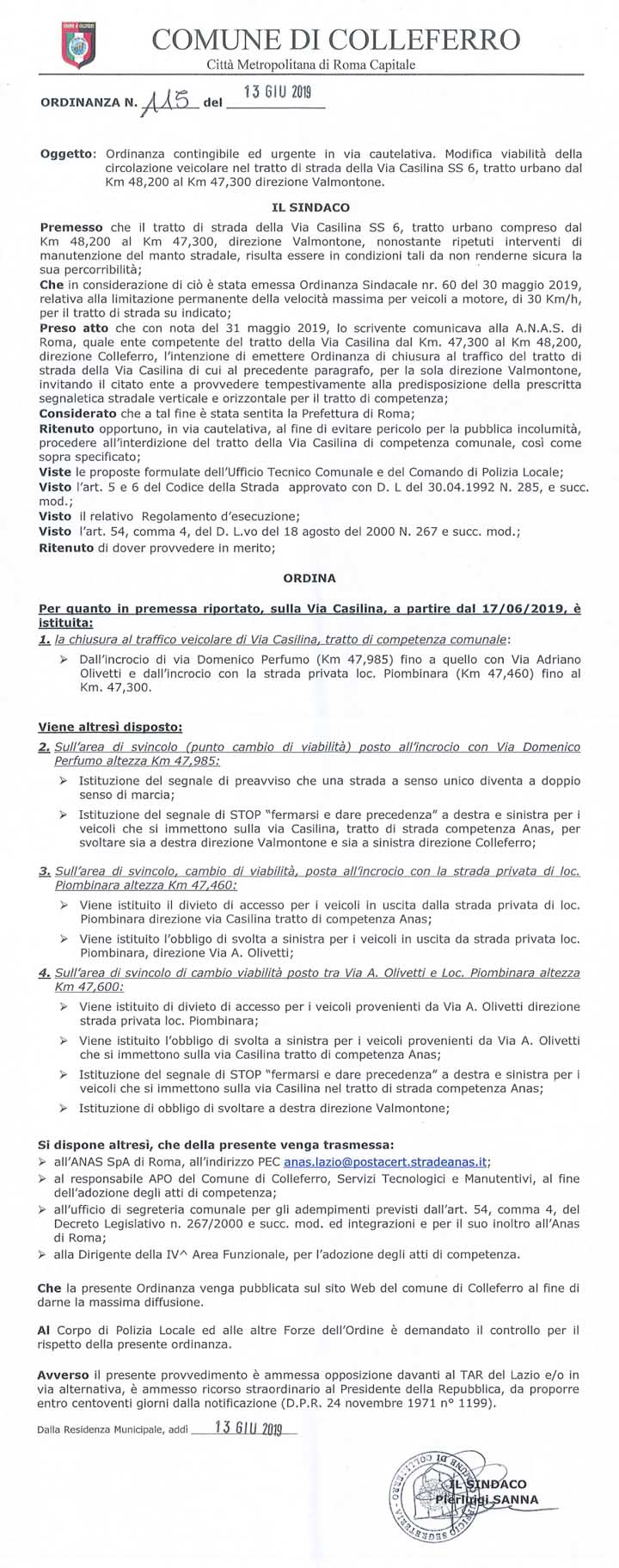 La decisione è stata presa dal Sindaco di Colleferro Pierluigi Sanna, dopo i vani tentativi di far sistemare il tratto viario in questione a cura dell’Anas, l’ordinanza n. 115 del 13 Giugno 2019 [qui •>].