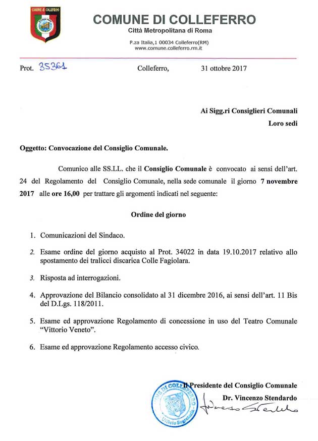 COLLEFERRO (RM) – È stata fissata per il pomeriggio di oggi, 7 Novembre alle ore 16, una seduta del Consiglio Comunale con i seguenti punti all’ordine del giorno.