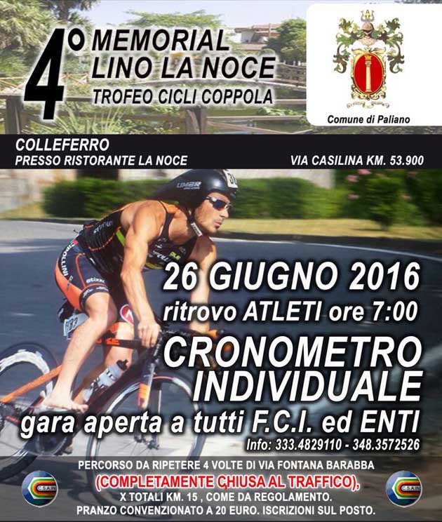 COLLEFERRO (RM) | PALIANO (FR) – Si terrà il prossimo 26 Giugno il quarto memorial “Lino La Noce”, gara cronometro individuale aperta a tutti gli atleti iscritti alla Federazione Ciclistica Italiana ed Enti.