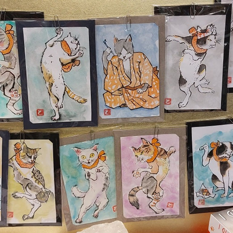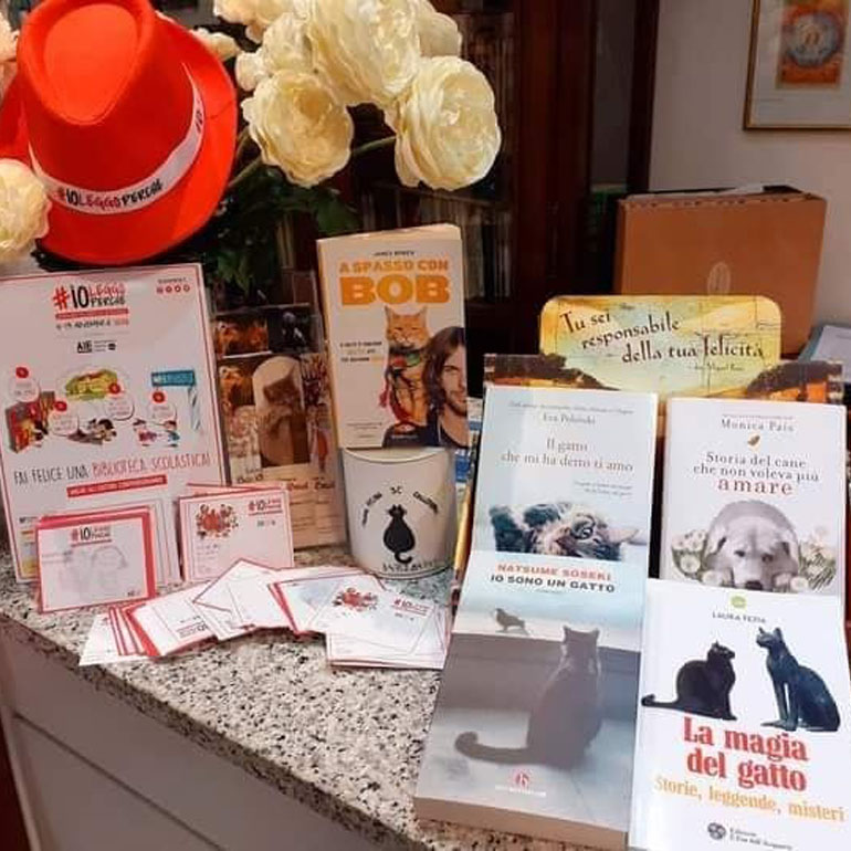 In Libreria è stata anche allestito un piccolo spazio dove sono posti in bella mostra le creazioni di Alessia Onorati, piccoli quadri e d “Etegami”, fogli di carta di riso assorbente (formato cartolina) con disegni realizzati a pennello ispirati ai gatti dell’artista Tomoko Momoki , pittrice giapponese, laureatasi all’accademia di Belle Arti di Tokyo, che vive e lavora a Colleferro. La sua pittura è, nella maggior parte delle opere, impressionista in chiave contemporanea. Parte del ricavato della vendita degli oggetti in esposizione sarà devoluto alla Colonia Felina 3C.