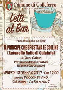 COLLEFERRO (RM) – Presentato nel pomeriggio di Venerdi 13 Gennaio, nell’ambito dell’iniziativa promossa dall’Amministrazione Comunale “Letti al Bar”, presso l’insolita location del “Boccon di Vino” in Via Petrarca a Colleferro, il libro di Giusy Colmo, dal titolo “Il Principe che spostava le colline – Antonello Ruffo di Calabria”, Castelvecchi Editore.