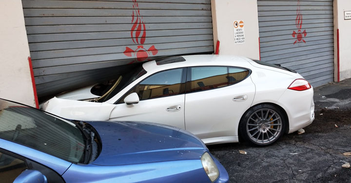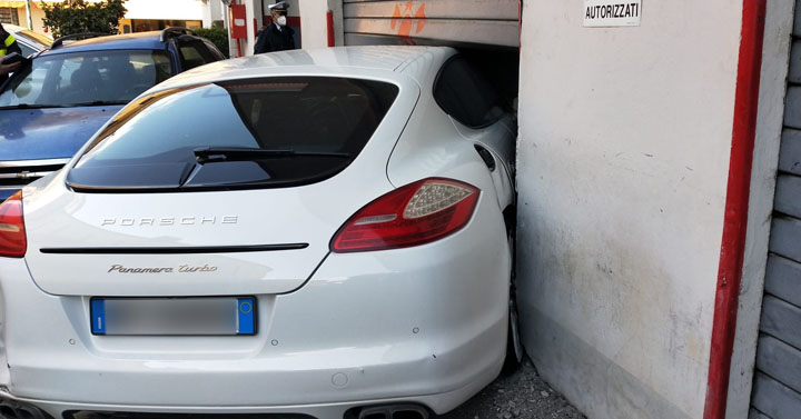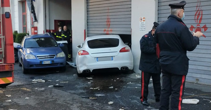 Una Porsche Panamera 4 porte ha perso il controllo e, dopo aver raso al suolo una panchina, abbattuto un vaso di cemento, ed urtato un paio di autovetture, ha finito la sua corsa all’interno dell’autorimessa della caserma dei Vigili del Fuoco sfondandone la saracinesca.