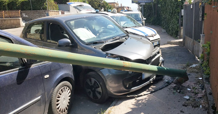 Colleferro. Perde il controllo dell’auto, abbatte un palo dell’illuminazione pubblica e colpisce un’auto parcheggiata lato strada