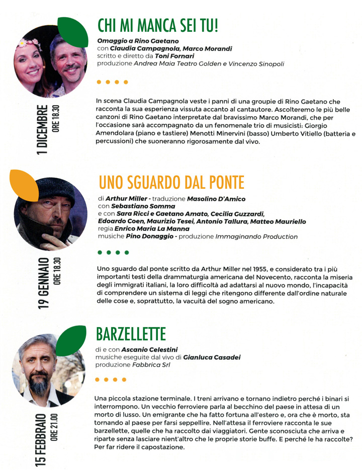 Sei spettacoli di grande successo di cui 5 debutteranno in questa stagione tra titoli originali e un classico del Teatro del Novecento, a rappresentare quindi Ia volontà di presentare a Colleferro quanto c’è di nuovo e originale nella scena contemporanea».