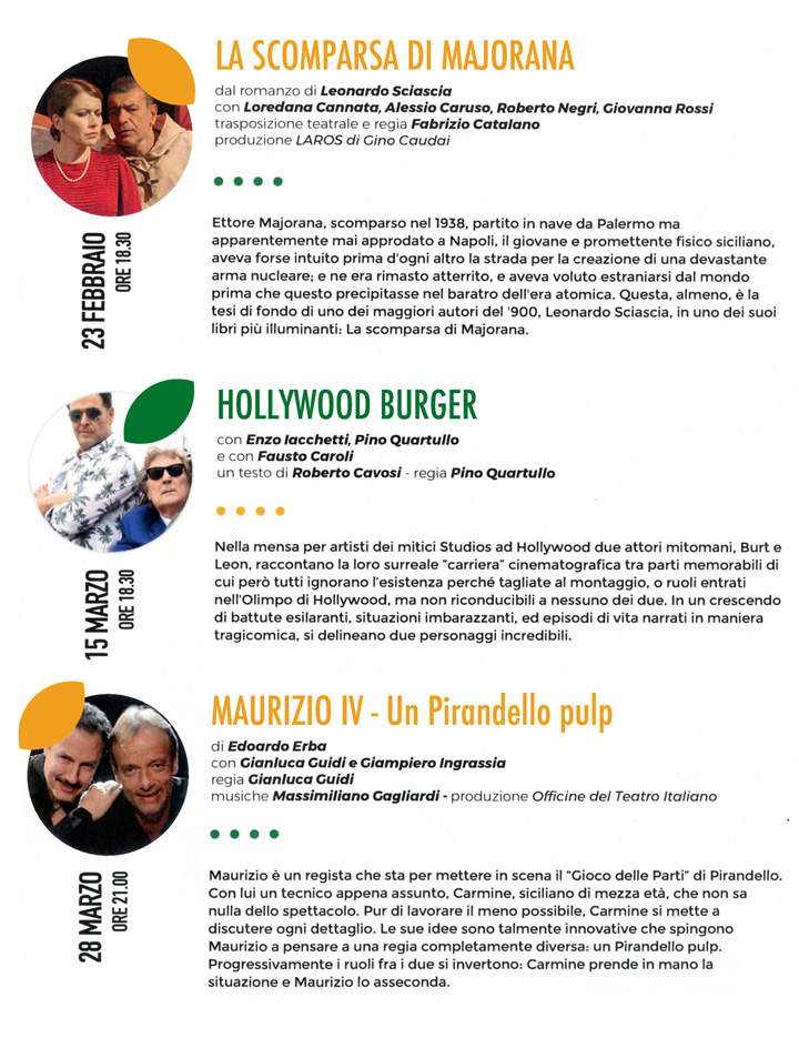 Tratto dal romanzo di Leonardo Sciascia, LA SCOMPARSA DI MAJORANA il 23 Febbraio ore 18.30 con Loredana Cannata, Alessio Caruso, Roberto Negri, Giovanna Rossi, racconta del giovane e promettente fisico siciliano scomparsa nel 1938, partito in nave da Palermo ma apparentemente mai approdato a Napoli. Majorana aveva forse intuito prima d’ogni altro la strada per la creazione di una devastante arma nucleare; e ne era rimasto atterrito, e aveva voluto estraniarsi dal mondo prima che questo precipitasse nel baratro dell’era atomica.