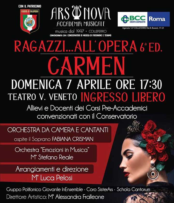COLLEFERRO – L’Accademia Musicale Ars Nova di Colleferro si presenta il 7 Aprile al pubblico del Teatro Comunale Vittorio Veneto con “Carmen”, la 6° Edizione di “Ragazzi… all’Opera” ad ingresso libero, firmata dal M° Luca Pelosi.