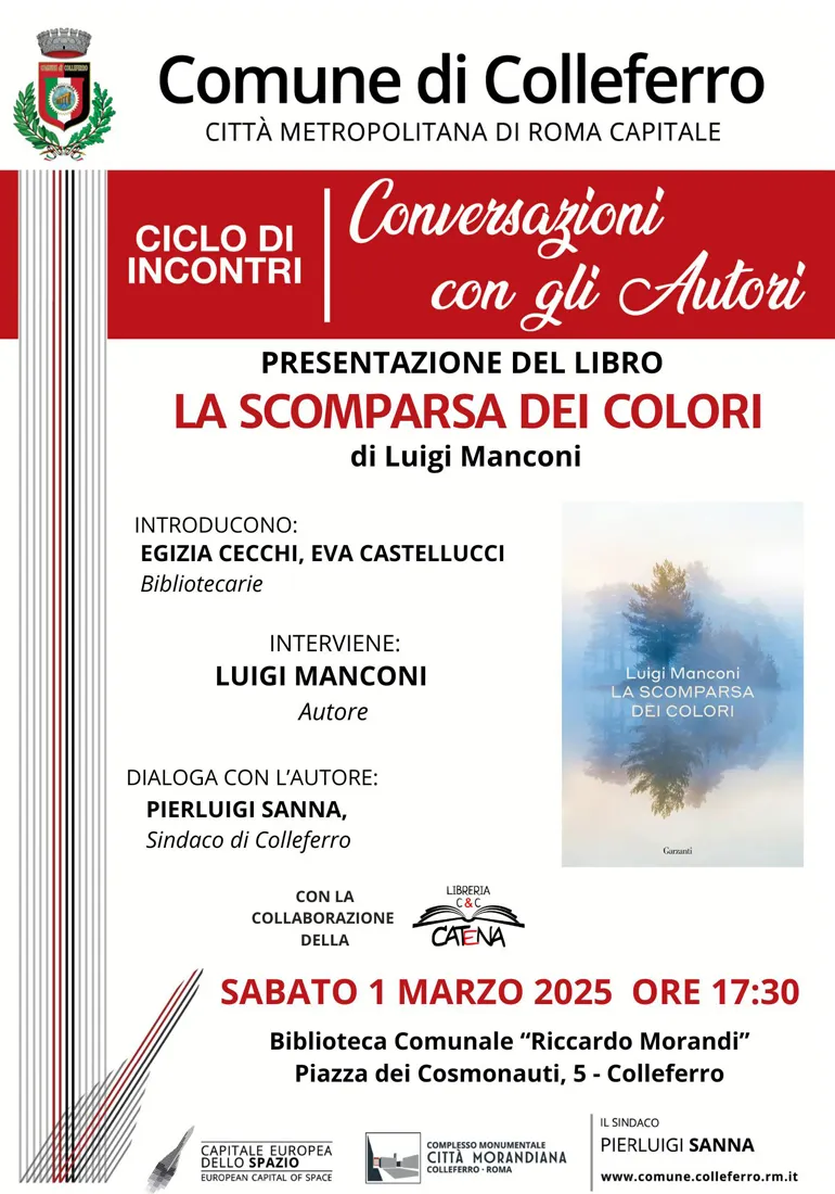 COLLEFERRO – Sabato 1 Marzo alle ore 17.30 presso la Biblioteca Comunale “Riccardo Morandi” sarà presentato il libro “La scomparsa dei colori” di Luigi Manconi, sociologo, giornalista e politico, ha fondato l’associazione per la tutela delle libertà “A buon diritto”.