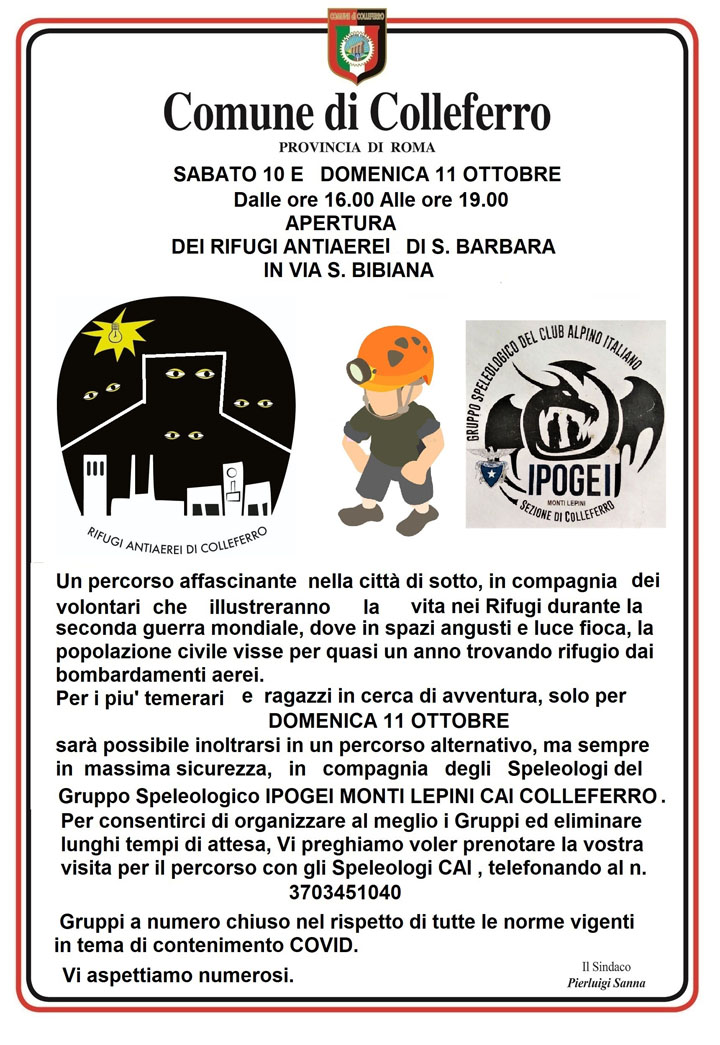 COLLEFERRO (Eledina Lorenzon) – Sabato 10 e Domenica 11 Ottobre dalle ore 16 alle ore 19, riprende l’attività, nel pieno rispetto delle norme anti-Covid, nei Rifugi Antiaerei di S. Barbara a Colleferro con le visite guidate per scoprire l’anima storica della città.