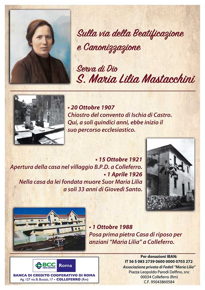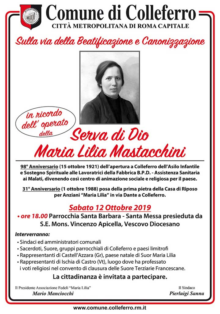COLLEFERRO – Sulla via della Beatificazione e Canonizzazione di Suor Maria Lilia Mastacchini, l’Associazione “Fedeli di Maria Lilia” – con il Patrocinio del Comune di Colleferro – per questo Sabato 12 Ottobre ha organizzato a Colleferro una giornata di incontro che avrà il culmine con la Santa Messa officiata nella Chiesa madre di S. Barbara dal Vescovo della Diocesi Suburbicaria Velletri-Sagni S.E.R. Mons. Vincenzo Apicella.