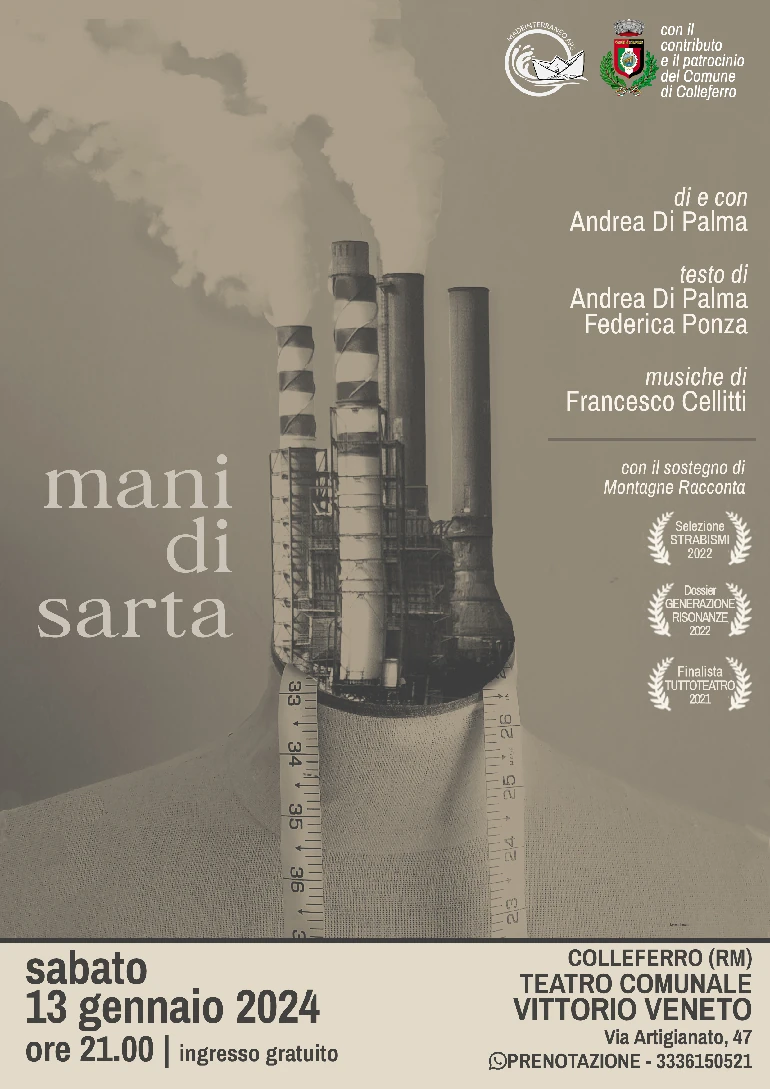 COLLEFERRO — Sabato 13 alle ore 21, presso il Teatro Comunale Vittorio Veneto, andrà in scena “Mani di Sarta”, spettacolo sul disastro ambientale della Valle del Sacco.