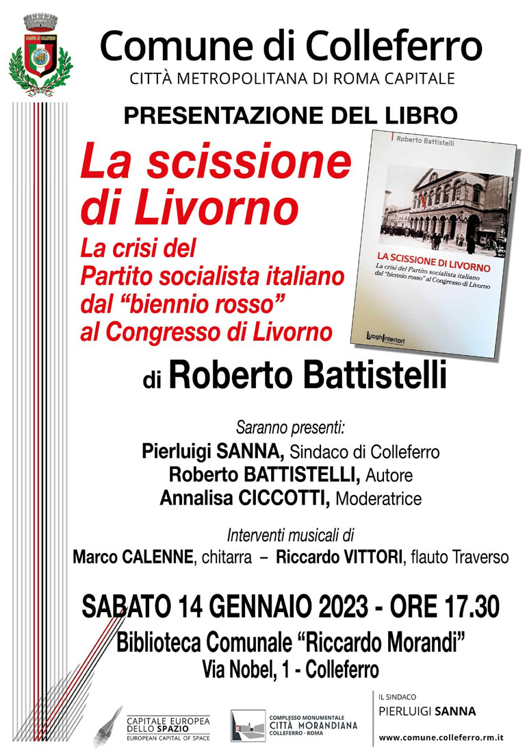 COLLEFERRO – Sabato 14 Gennaio alle ore 17.30, presso la Biblioteca Comunale “Riccardo Morandi”, sarà presentato il libro “La scissione di Livorno. La crisi del Partito socialista italiano dal «biennio rosso» al Congresso di Livorno” di Roberto Battistelli.
