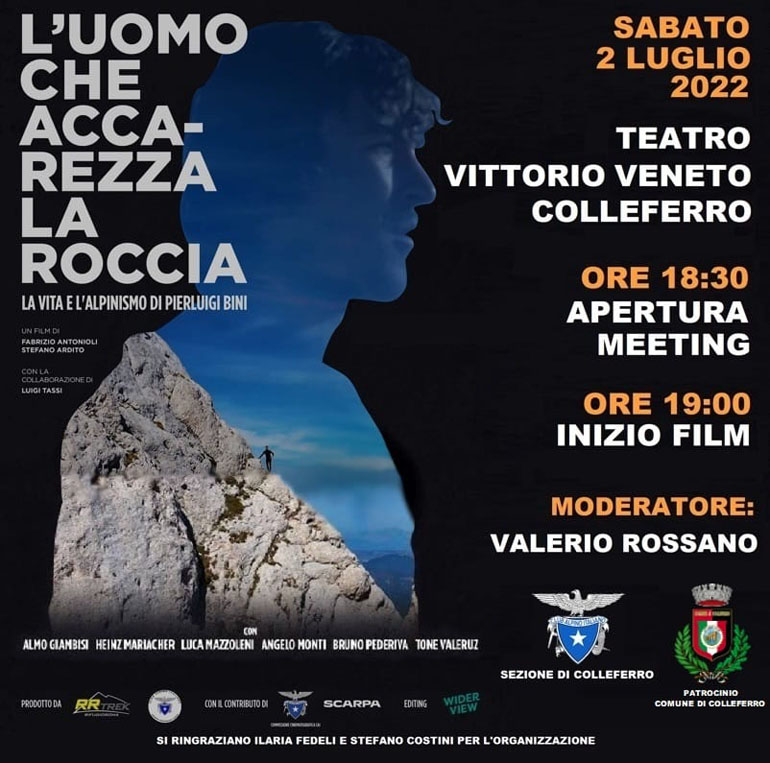 L’inizio dell’incontro è previsto alle ore 18,30, e dopo i saluti di benvenuto del Presidente Renzo Cellitti e del moderatore della serata Valerio Rossano, verrà proiettato il Docu-film “L’uomo che accarezza la roccia”, un cortometraggio che racconta la vita, i compagni di cordata e le imprese alpinistiche di Pierluigi Bini, con la regia di Stefano Ardito e Fabrizio Antonioli, con la produzione di David Ciferri e RRTrek, con la collaborazione di Luigi Tassi e il contributo del Cai – Gruppo Regionale Lazio, della Commissione Cinematografica Centrale del Cai e di Scarpa. (il trailer in apertura)