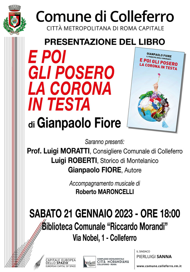 Colleferro. Sabato 21 Gennaio alle ore 18, presso la Biblioteca Comunale R. Morandi, Gianpaolo Fiore presenterà il suo libro “E poi gli posero la corona in testa”