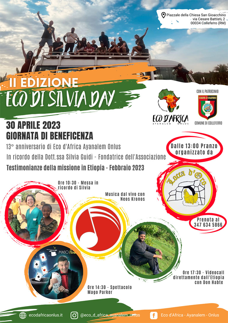 COLLEFERRO SCALO – Domenica 30 Aprile 2023 dalle ore 10.30 alle ore 20.00 si terrà la seconda edizione dell’evento “Eco di Silvia Day” in Piazza S. Gioacchino, a Colleferro Scalo organizzata dall’Associazione “Eco d’Africa Ayanalem” Onlus con il patrocinio del Comune di Colleferro.