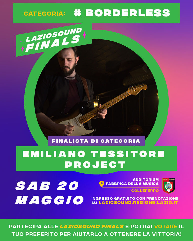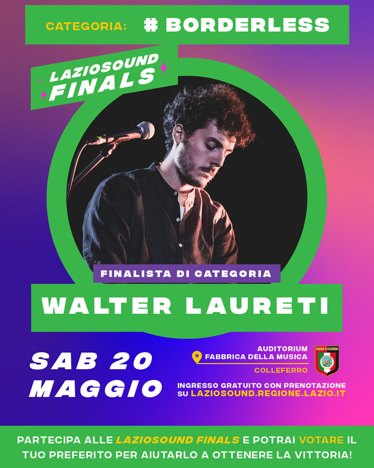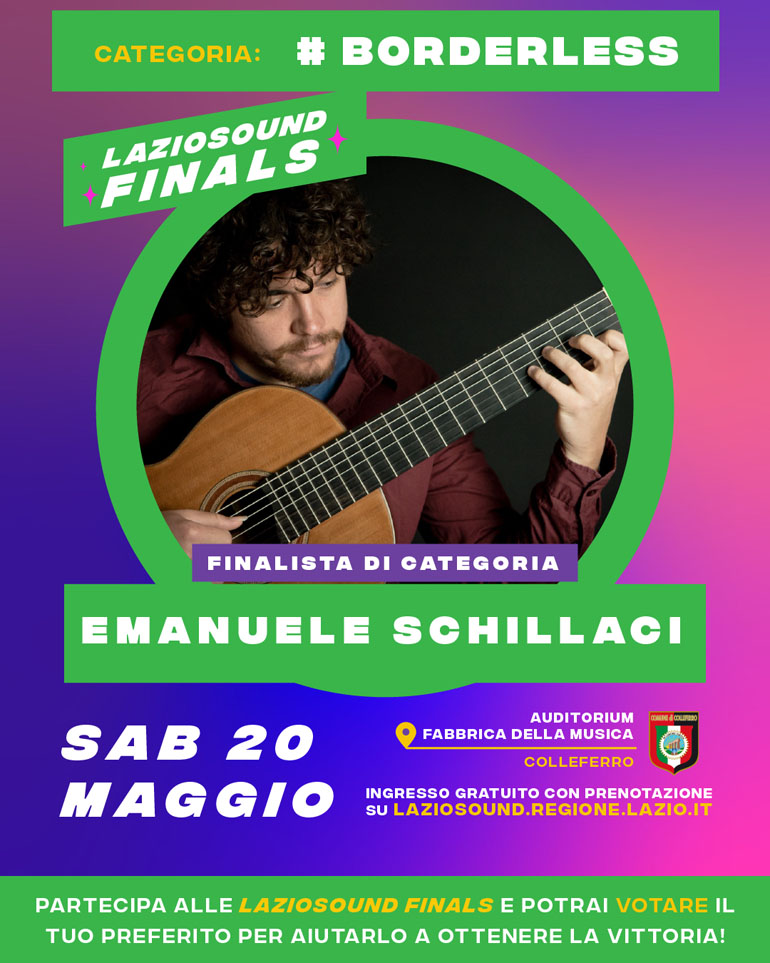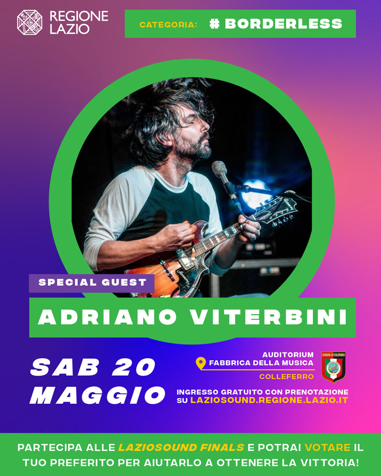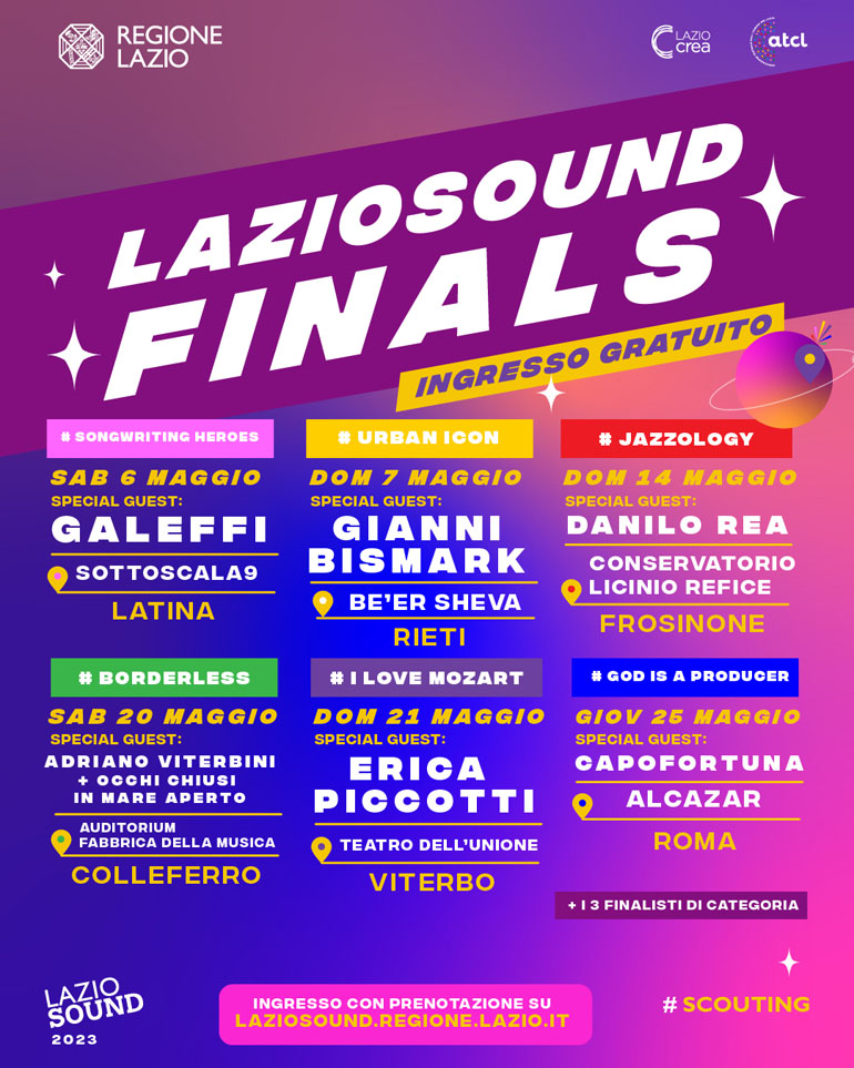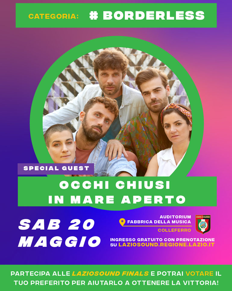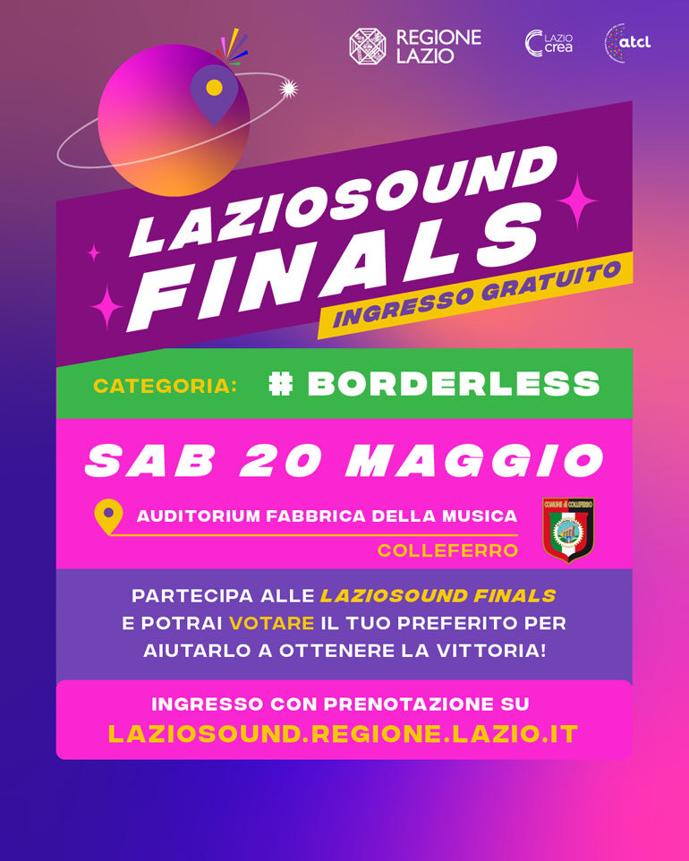 L’evento rappresenta una tappa del “viaggio” delle finali della terza edizione di LAZIOSound – il programma della Regione Lazio a sostegno della musica under35 – che, dopo i primi appuntamenti (la finale della categoria Songwriting Heroes il 6 Maggio, quella di Urban Icon il 7 Maggio e quella di Jazzology che si terrà il 14 Maggio), annuncia l’appuntamento con la finale della categoria Borderless, attesa il 20 Maggio all’Auditorium di Colleferro.