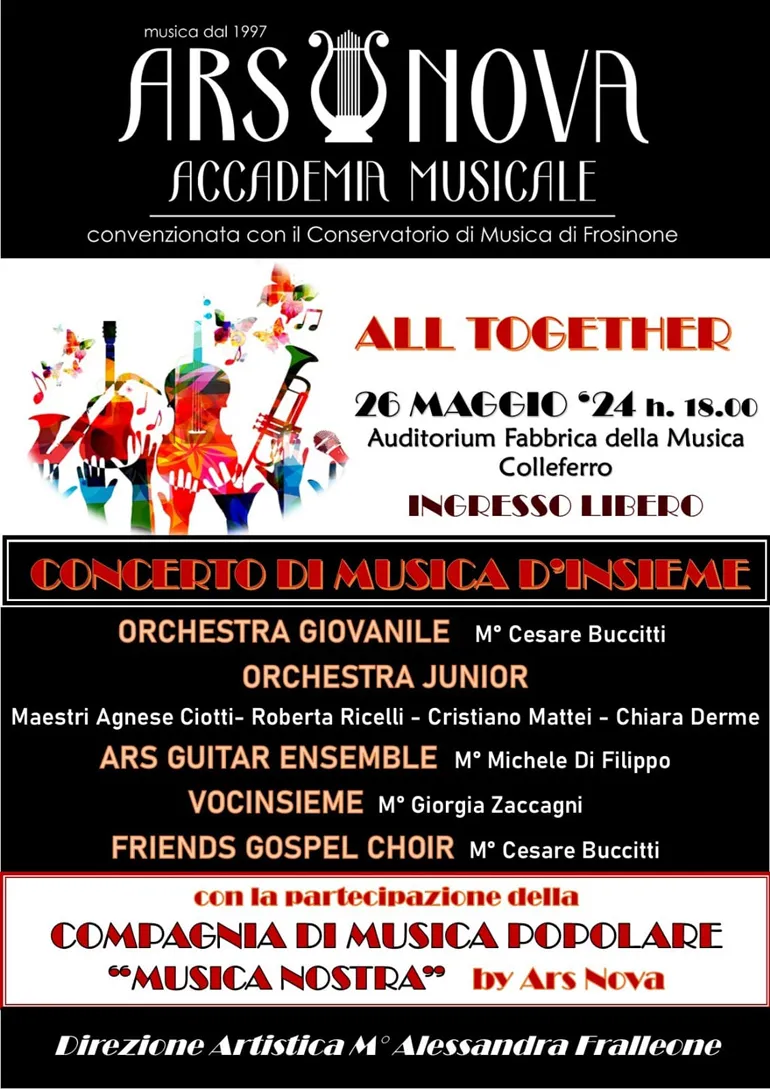 L’intero weekend di musica all’Auditorium “Fabbrica della Musica” avrà il suo momento clou nel pomeriggio di Domenica 26 Maggio, alle ore 18, con “All Together”, Concerto di Musica d’Insieme in cui si esibiranno: