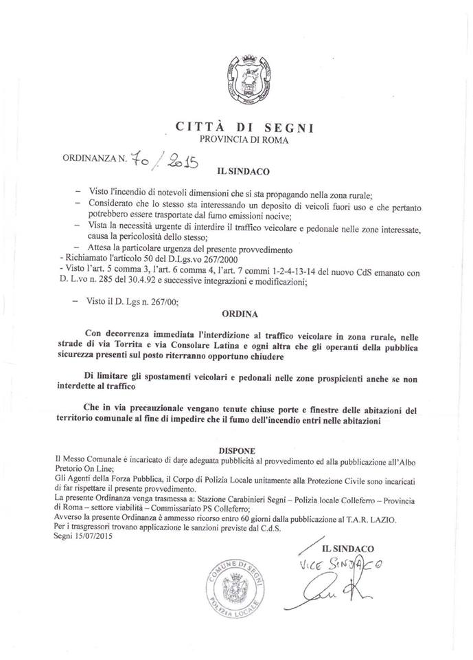 Il Sindaco di Segni Maria Assunta Boccardelli ha emesso un’ordinanza per l’interdizione al traffico e per la chiusura delle finestre nelle zone adiacenti all’area interessata dall’incendio (leggila qui •>)