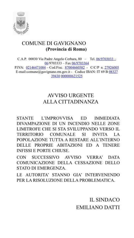Il Sindaco di Gavignano Emiliano Datti ha invece emesso un avviso alla cittadinanza di rimanere in casa e di tenere chiusi gli infissi (leggilo qui •>).