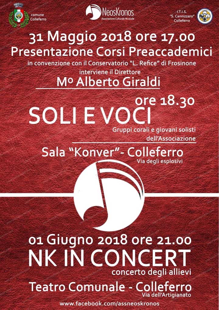 COLLEFERRO – Nel pomeriggio di ieri, 31 Maggio, presso la sala Konver in Via degli Esplosivi a Colleferro, sono stati presentati, in un incontro pubblico, i nuovi Corsi “base” e “Preaccademici” che l’Associazione Culturale musicale Neos Kronos terrà in convenzione con il Conservatorio Statale di Musica L. Refice di Frosinone.
