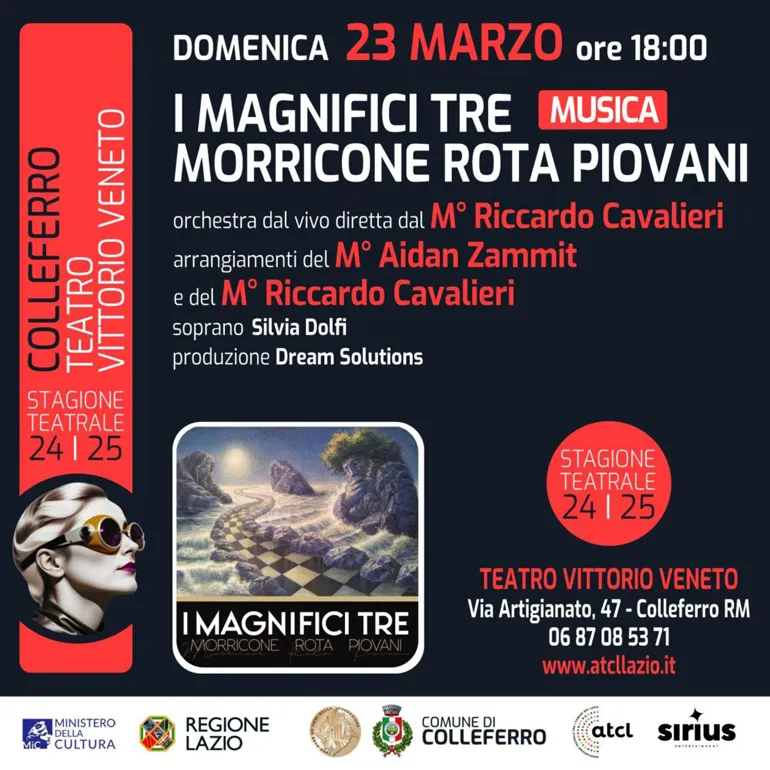 COLLEFERRO – Domenica 23 Marzo alle ore 18 al Teatro comunale Vittorio Veneto va in scena “I Magnifici Tre – Morricone Rota Piovani”, quinto appuntamento della Stagione teatrale 2024/25 di Colleferro.