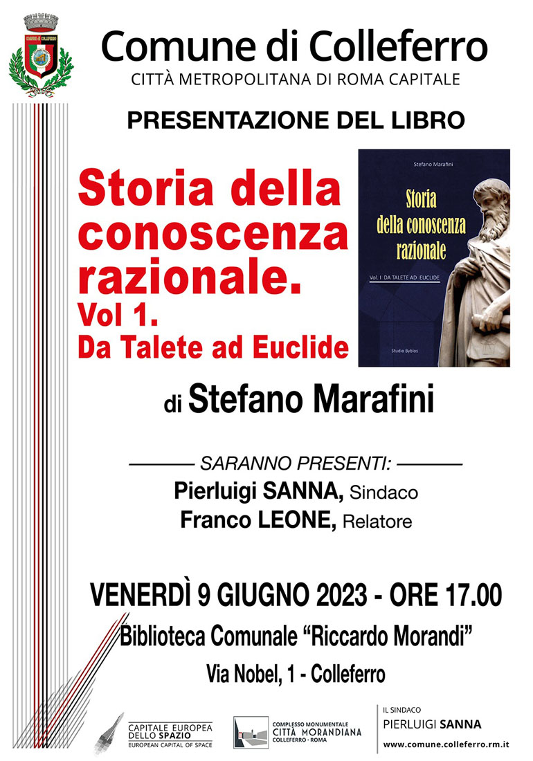 COLLEFERRO – Venerdì 9 Giugno alle ore 17 presso Biblioteca Comunale “Riccardo Morandi” di Colleferro, verrà presentato il saggio di Stefano Marafini dal titolo “Storia della conoscenza razionale. Vol. 1 – Da Talete ad Euclide”