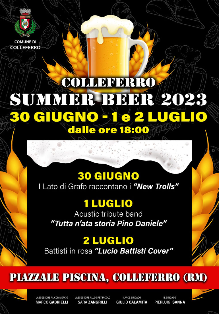 COLLEFERRO – Sarà il “prologo” a “Colleferro Estate 2023” (al via il 4 Luglio), l’evento “Summer Beer 2023”, patrocinato dal Comune di Colleferro, che nei giorni 30 Giugno, 1 e 2 Luglio si svolgerà in Largo Unitalsi (Piazzale della Piscina) in Viale Europa a Colleferro.