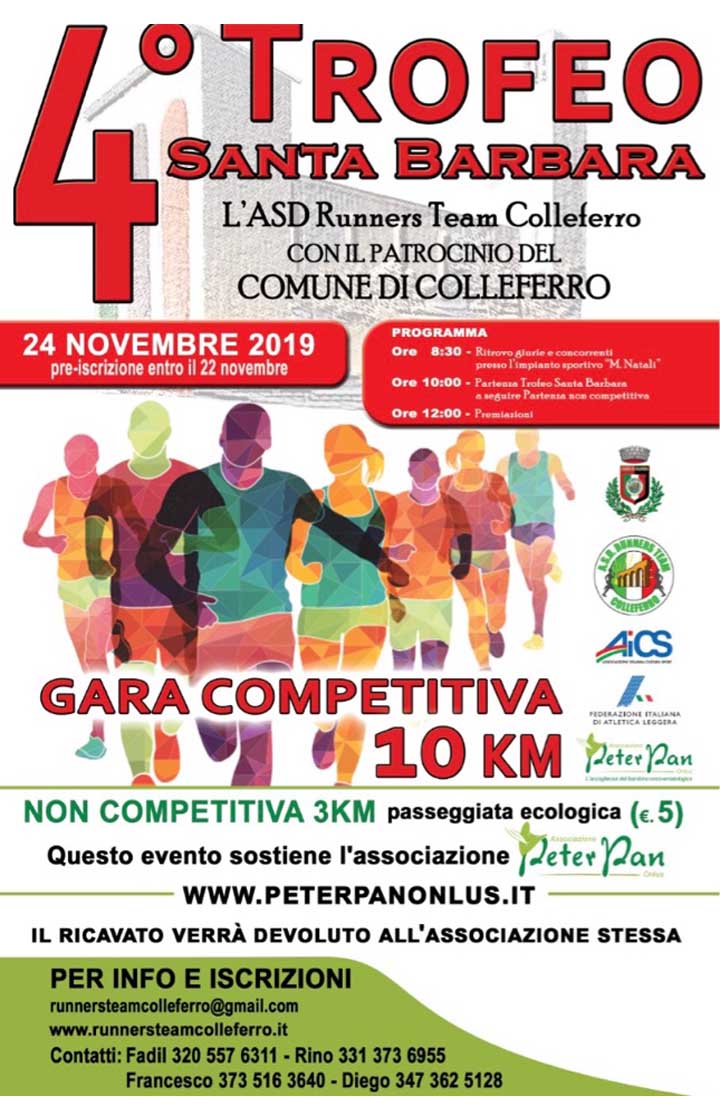 COLLEFERRO – Anche quest’anno, per il quarto anno consecutivo, torna il Trofeo Santa Barbara, l’appuntamento sportivo podistico organizzato dalla Asd Runners Team Colleferro.