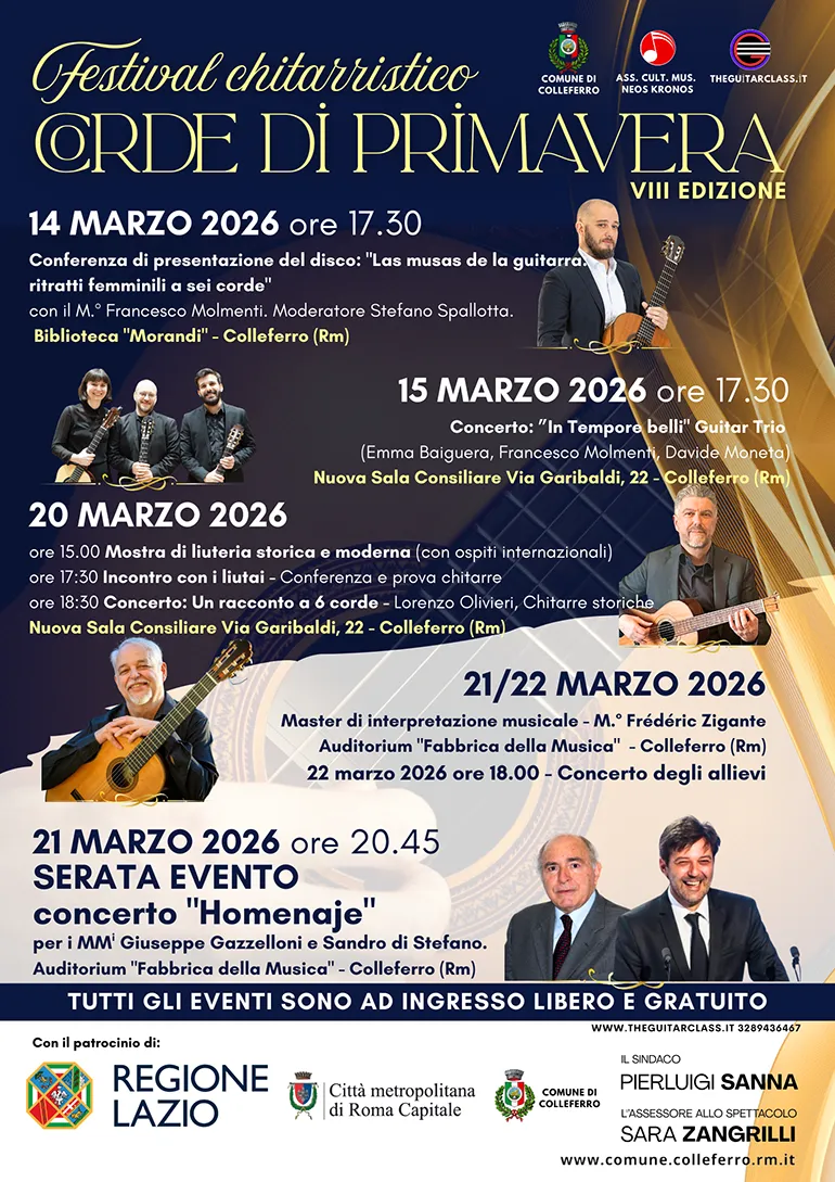 COLLEFERRO – L’Associazione Culturale Musicale Neos Kronos – theGuitarClass.it – con il il prezioso supporto e patrocinio del Comune di Colleferro, della Regione Lazio e della Città Metropolitana di Roma Capitale – presenta la VIII Edizione del Festival chitarristico “Corde di Primavera”, in programma dal 14 al 22 Marzo 2026.